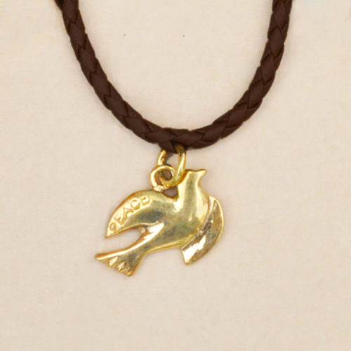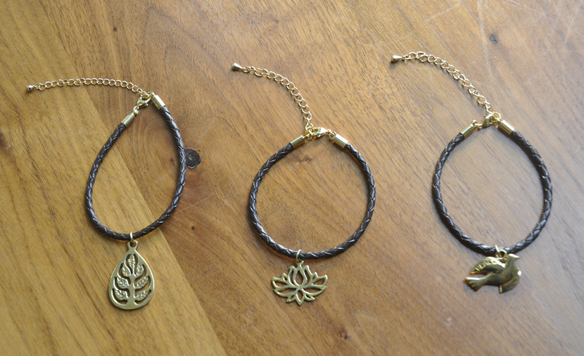 カンボジアのジュエリー作家チャンタさんが、銃弾の薬きょうを素材に平和への想いを込めた手づくりのアクセサリー。美しい細工のチャームがポイントの、シンプルなレザーブレスレットです。